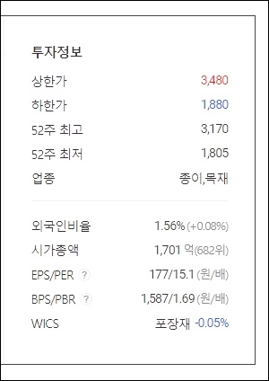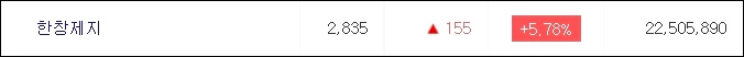 한창제지는 1주당 3000원 미만의 주가를 가지고있지만 7월 1일 장중 가격 +5.78% 상승중 입니다.