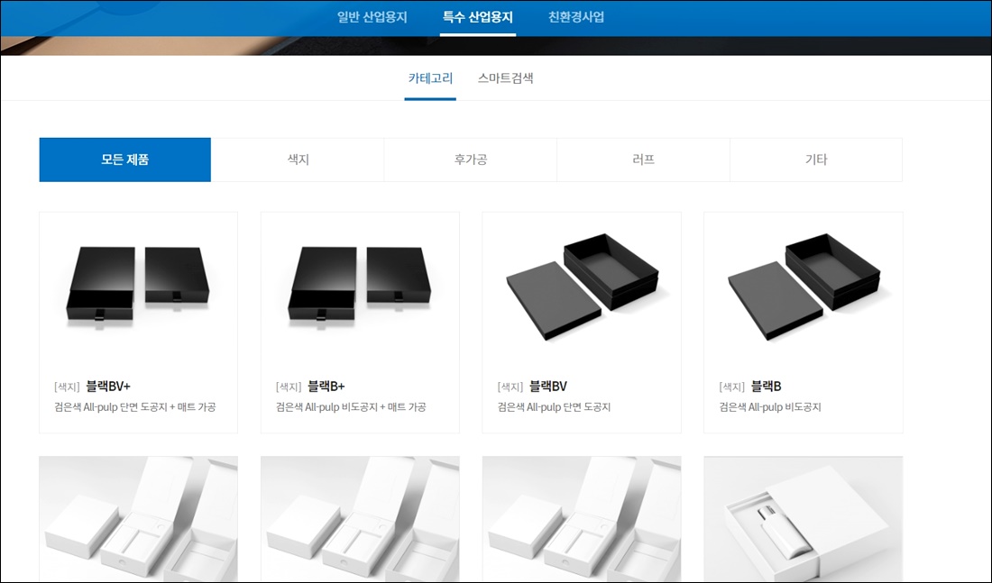 특수 산업용지로 색지가 활용된 검은색 All-pulp 단면도공지 및 비도공지 등의 제품을 찾을 수 있는 것으로 보입니다.