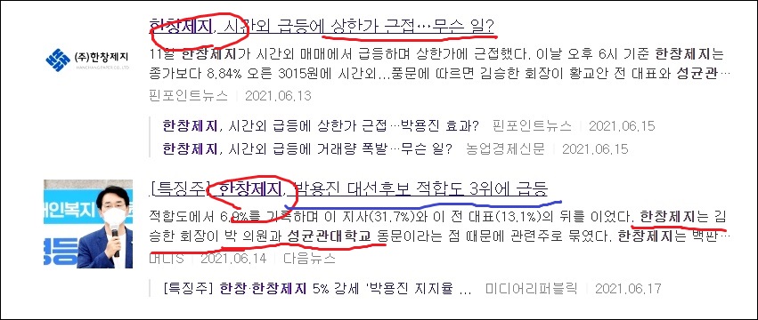 왜냐면 한창제지 김승한 회장이 박용진 대선후보와 성균관대학교 동문이어서 주가가 묶여서 올라갔던 것입니다.