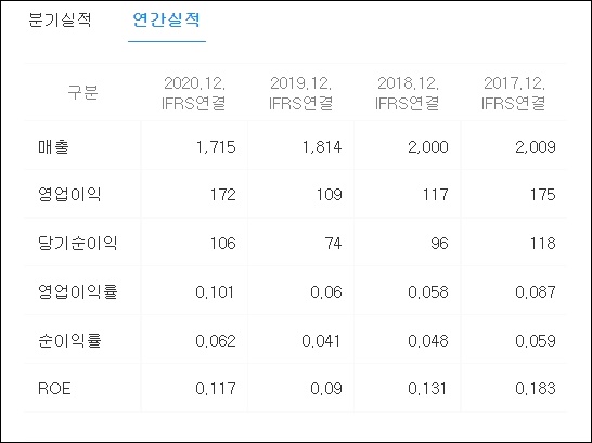 한창제지의 분기실적과 연간 실적이 확인 가능합니다. 2021년 03년 IFRS연결에서 확인 가능한 매출은 430억이며 영업이익은 47억 당기순이익은 36억이며 영업이익률은 0.109, 순이익률은 0.083, ROE는 0.037입니다. 연간 실적은 2020년 12월 매출 1,715억, 영업이익 172억, 당기순이익 106억으로 확인됩니다. 영업이익률은 0.101, 순이익률은 0.062억, ROE는 0.117입니다.