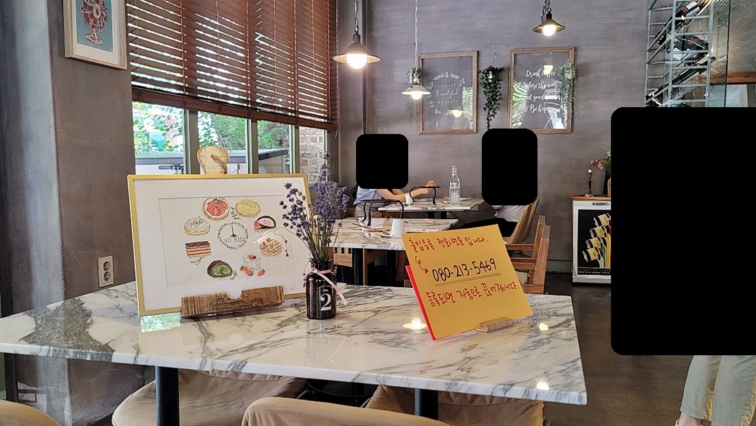 내부 분위기는 이러하며, 출입등록 전화번호가 적혀져있고, 대리석 식탁이 눈에 뜨입니다