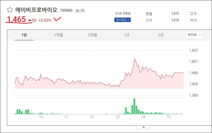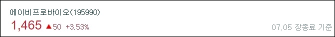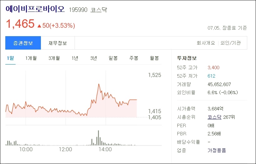 1주당 가격 1,465원을 가진 에이비프로바이어 주가는 7월 5일 장종료 기준 3.53%오른채로 마감이 되었습니다.
