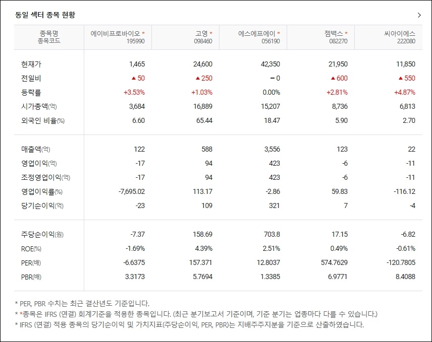 동일 섹터 종목으로 고영, 에스에프에이, 젬백스, 씨아이에스 가 언급되었으며 전일비 등락률이나 매출액등 재뭇아황, 주당순이익 ,ROE/PER/PBR등을 비교하여 에이비프로바이오 주가 전망을 예측해 보시길 바랍니다.