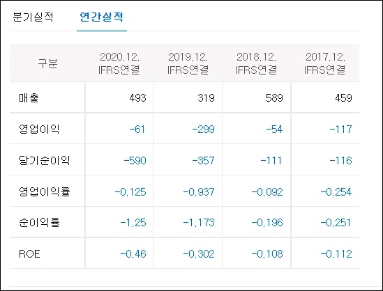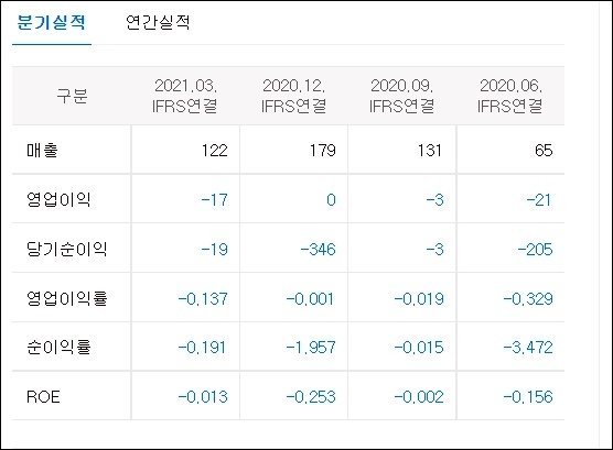 에이비프로의 분기실적과 연간실적을 살펴보아 투자를 해 보시는 방법이 있을것 같습니다. 2020년 영업이익과 당기순이익, 순이익률 등에서 손실이 확인되며 연간 ROE역시 비교해 보실 수 있습니다.
