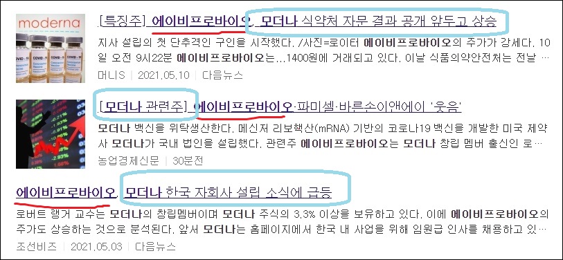 지난 5월에는 모더나에 관련한 식약처 자문 결과가 공개된다는 소식과 함께 모더나 관련주로서 에이비프로바이오 주가 변동이 있었다고 합니다.