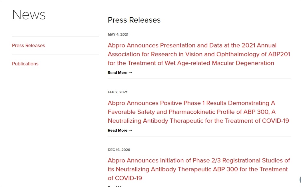 홈페이지에서 관련 최근뉴스를 확인할 수 있었는데요, ABP300에 관련한 물질에 대한 정보가 쓰여 있었으며, 이것은 코로나 치료를 위한 (for the Treatment of COVID-19)라는 물질이라고 합니다.
