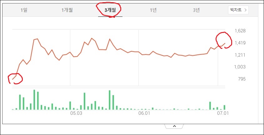 에이비프로바이오 주가의 3개월치 변동사항인데요 지난 4월 올라주고 동전주 신세를 면하였습니다. 그 이후 천원대의 가격에서 횡보하는 모양새라고 보여집니다. 하지만 7월 초부터 살짝의 반등구간이 엿보입니다.