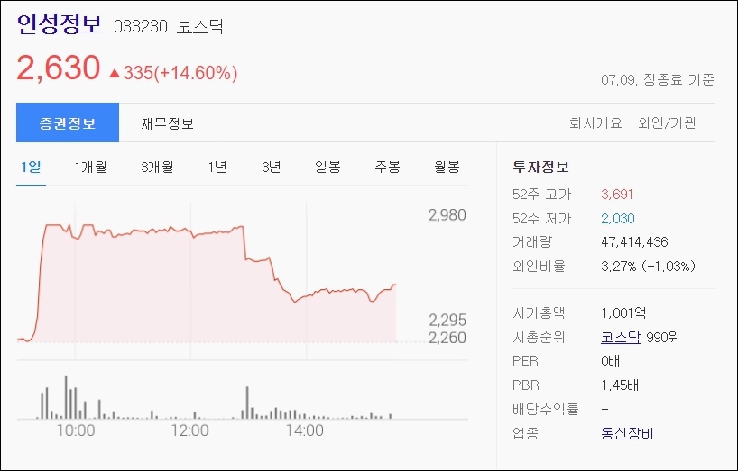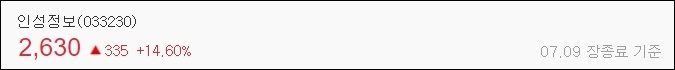 인성정보는 1주당 가격이 2천6백30원에 마무리가 되었습니다. 7월 9일 장 종료 기준으로 이 날 하루 주가가 14.60%가 올랐습니다.