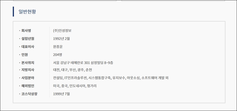 또한 인성정보는, 클라우드 사업뿐만 아니라 컨설팅 사업이나 시스템통합구축과 아웃소싱 등의 사업까지 영위하고 있으며 해외법인은 미국과 중국, 인도네시아, 헝가리에 있다고 합니다. 인성정보는 코스닥에 상장되었으며 1999년 7월부터 상장되었다고 합니다.
