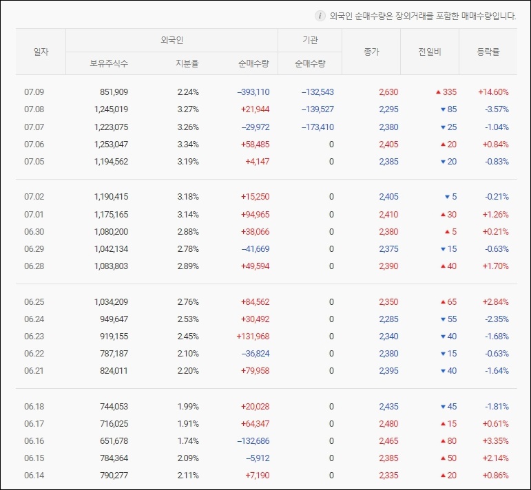 인성정보의 외국인 지분율은 지난 6월 14일 2.11%였으며 대략 1달이 지난 7월 9일은 외국인 지분율이 2.24%였습니다.