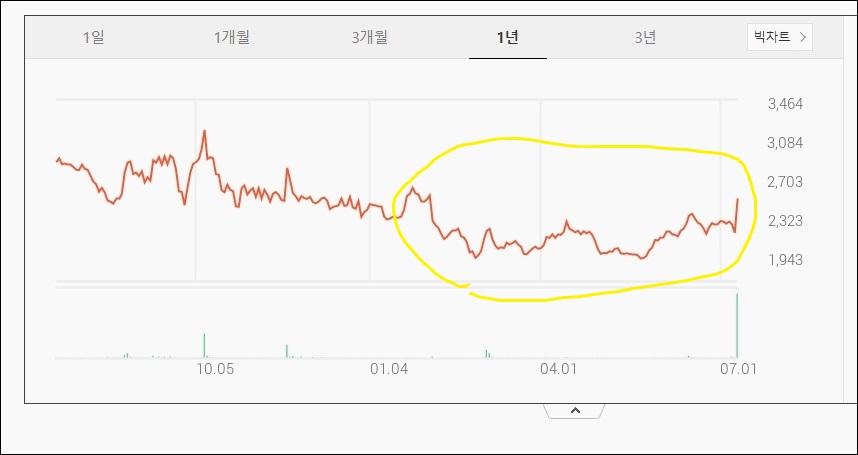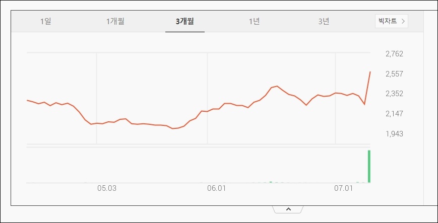 인성정보는 1개월간 거의 주가가 횡보하였다가 7월 6일 이후에 와서 주가가 상승하였고 1주당 가격은 2천원대 초반에서 2500원 이상으로 상승하였습니다.