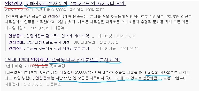 인성정보는 2021년 5월 기존의 사옥이 있었던 지역인 오금동에서 신사옥을 삼성동에 위치한 선정릉으로 이전한다고 밝혔습니다. 본사 이전 소식이 앞으로 인성정보가 클라우드 인프라 사업을 펼치기에 더 나은 기회를 만들어줄지에 대해 재고해봐야 할 것 같습니다.