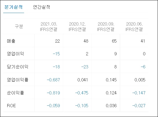 매출은 흑자였지만 영업이익과 당기순이익에서 손실이 확인됩니다. 영업이익률은 -0.687, 순이익률은 -0.819, ROE는 -0.059로 확인되었습니다.