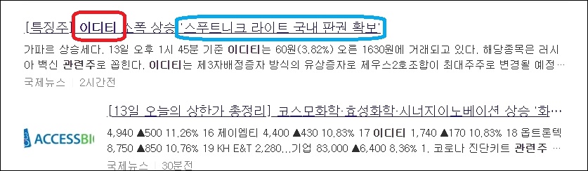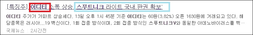 스푸트니크 라이트 국내 판권 문제에 관련하여 이디티가 특징주로 떠올랐습니다.