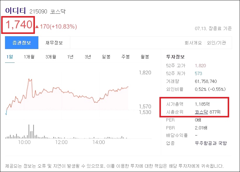 이디티는 한 주당 가격이 1,740원이며, 7월 13일 장 종료 기준으로 10.83% 주가가 상승하였습니다.