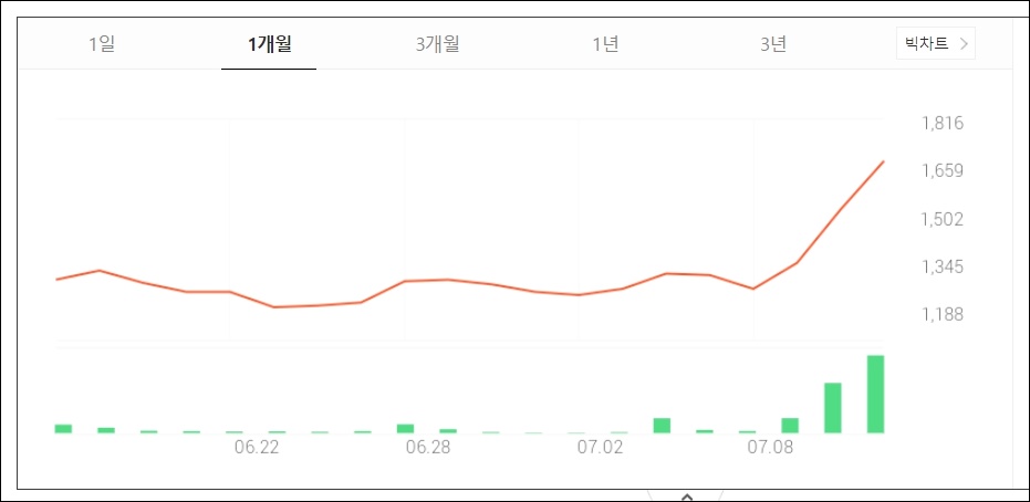 이디티는 1개월 동안 횡보를 하다가 7월 초반 이후 주가가 급등하였습니다.