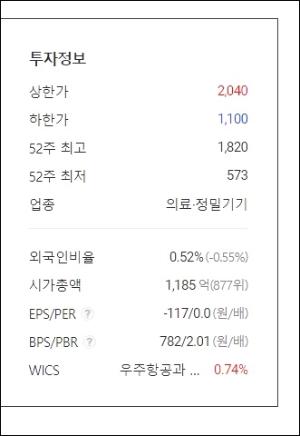 이로서 시가총액은 1,185억 가량이 되었으며 시총순위로 대략 코스닥 877위에 달하는 기업이라고 합니다.