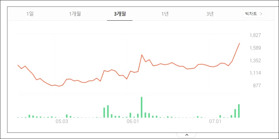 3개월 동안 이디티 주가는 살짝의 조정이 있은 후 상승, 6월-7월 횡보하다 또 한 번 크게 주가가 위로 쏘아주며 꾸준히 상승한 것을 볼 수 있습니다.