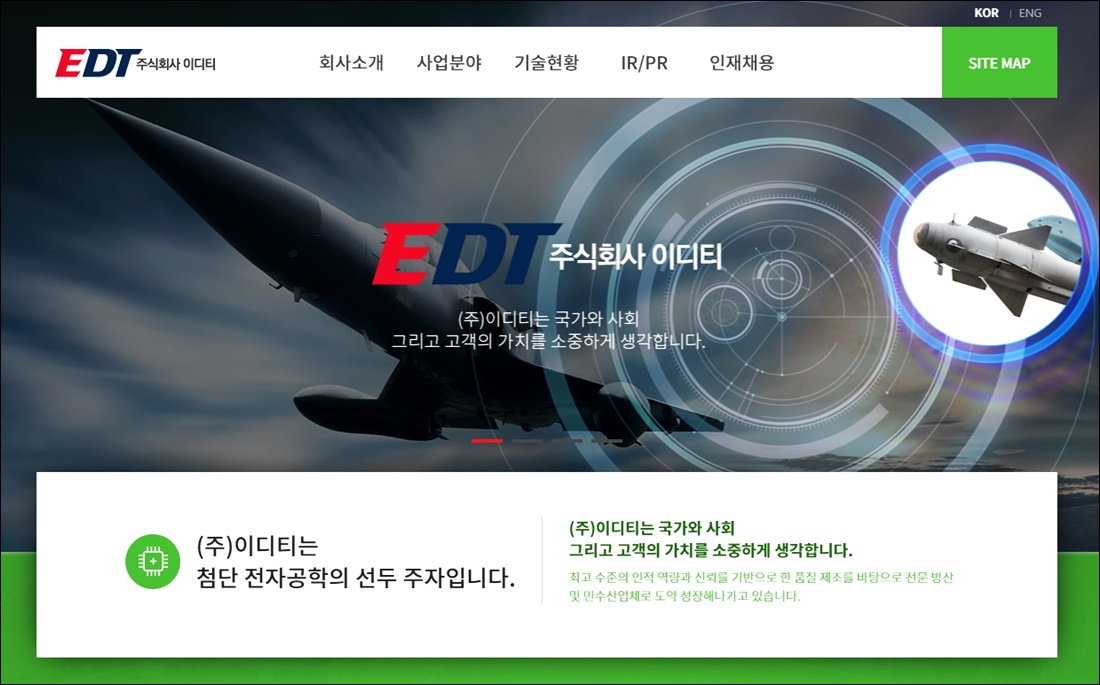 주식회사 이디티는 첨단 전자공학에 관련한 업무를 영위하고 있다고 하며, 국가와 사회&고객 모두를 소중하게 여긴다는 기업 모토를 확인할 수 있었습니다.