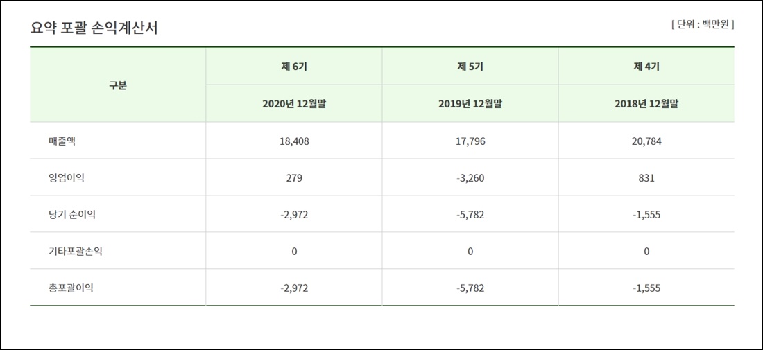 매출액은 18,408(단위:백만 원) 원으로 5기에 비해 증가하였으며 영업이익도 흑자에 전환하였습니다.