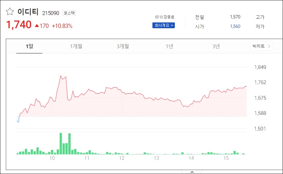 이디티는 한 주당 가격이 1,740원이며, 7월 13일 장 종료 기준으로 10.83% 주가가 상승하였습니다.