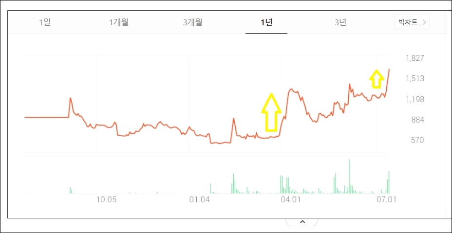 이 때에도 기대감을 안고 주가가 대폭 상승한 것 같습니다.