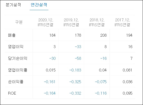 매출은 흑자였지만 영업이익과 당기순이익에서 손실이 확인됩니다. 영업이익률은 -0.687, 순이익률은 -0.819, ROE는 -0.059로 확인되었습니다.