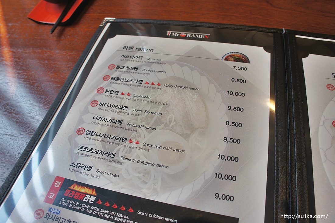 미스터라멘은 7500원이고 돈코츠라멘과 매운돈코츠라멘, 탄탄멘, 버터시오라멘, 나가사키라멘, 얼큰 나가사키라멘, 돈코츠 교자라멘, 소유라멘 등이 있습니다.
