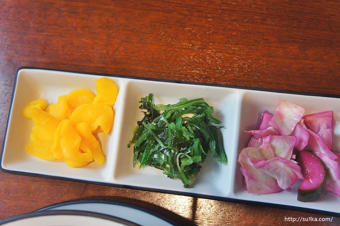 밑반찬은 마른 단무지와 나물 그리고 피클입니다.