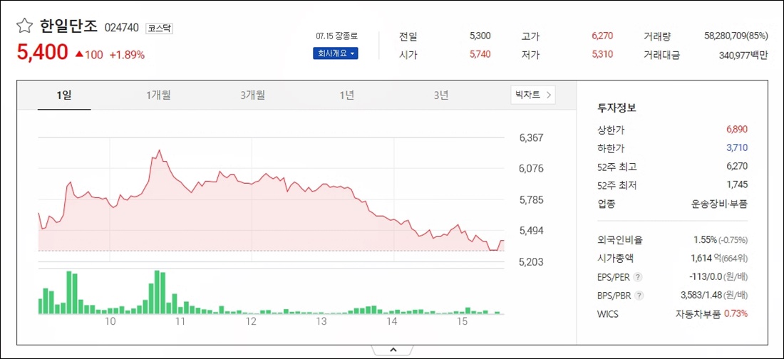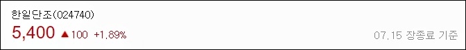 7월 15일 장종료 기준으로 한일단조의 주가는 5400원이 되었습니다. 이는 이전의 주가에 비해 1.89% 상승한 것이었습니다.
