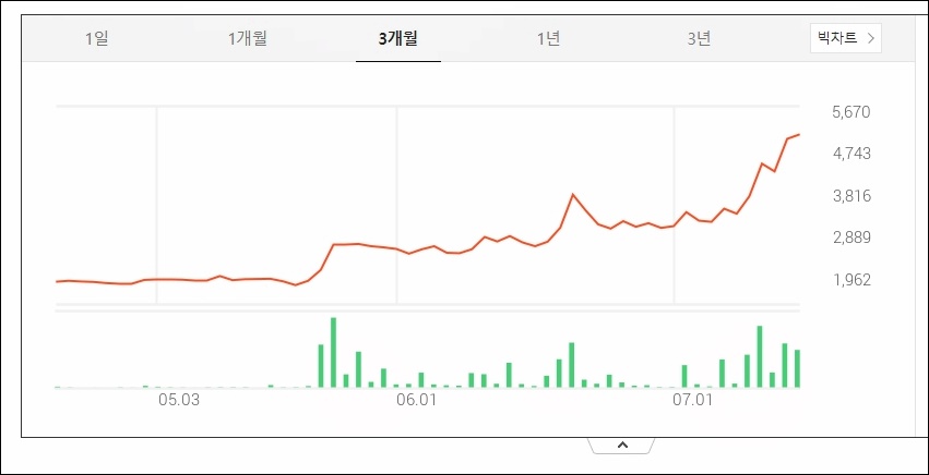 한일단조의 3개월치 주가 흐름입니다. 5월 박스권이었지만 6월 상승해주었고 7월 또 한번 상승하여 7월 15일 현재애는 주가가 5월에 비해 2배 이상 올랐습니다.
