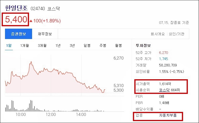 1주당 5400원의 주가라고 말씀드렸던 한일단조의 투자정보입니다.
