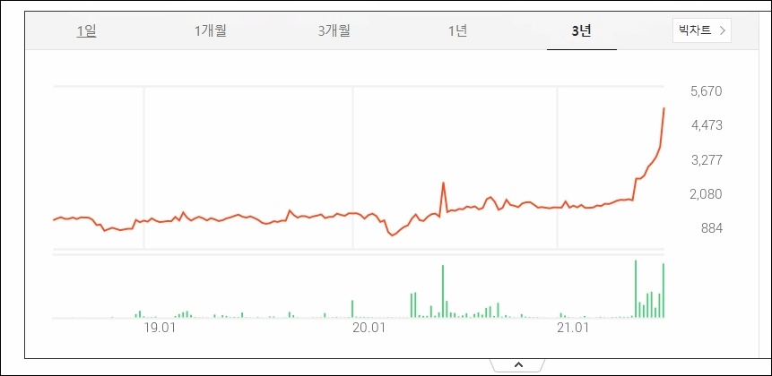 사실 2019년부터 2020년까지는 주가에 큰 변동이 없었다고 생각될 만큼 미세한 상승외에는 정체되어 있었는데요. 2021년부터 두드러지는 상승곡선이 보여집니다.