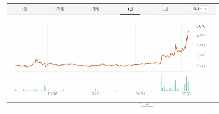 한일단조의 1년치 주가 흐름의 변동입니다. 작년 10월부터 4월까지 박스권이었지만 5월이후 스멀스멀 주가가 오르기 시작, 가파른 상승곡선을 보여주고 있습니다.