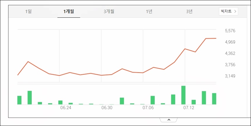 1개월 치 한일단조 주가의 변동입니다. 6월 말 살짝의 조정 이후로 흐름은 꾸준히 상승곡선을 그려주고 있습니다.
