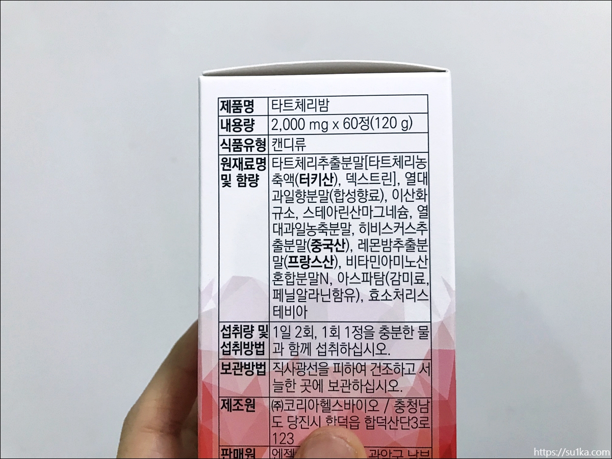 타트체리 추출분말은 농축액으로 만들어져 있나봅니다. 덱스트린 성분도 ㄷ르어있고요, 이산화규소 및 스테아린산마그네슘, 열대과일 농축분말, 히비스커스추출분말도 들어있었고요, 레몬 밤 추출분말이랑 비타민 아미노산 혼합분말, 아스파탐, 효소 처리 스테비아가 들어있었어요.