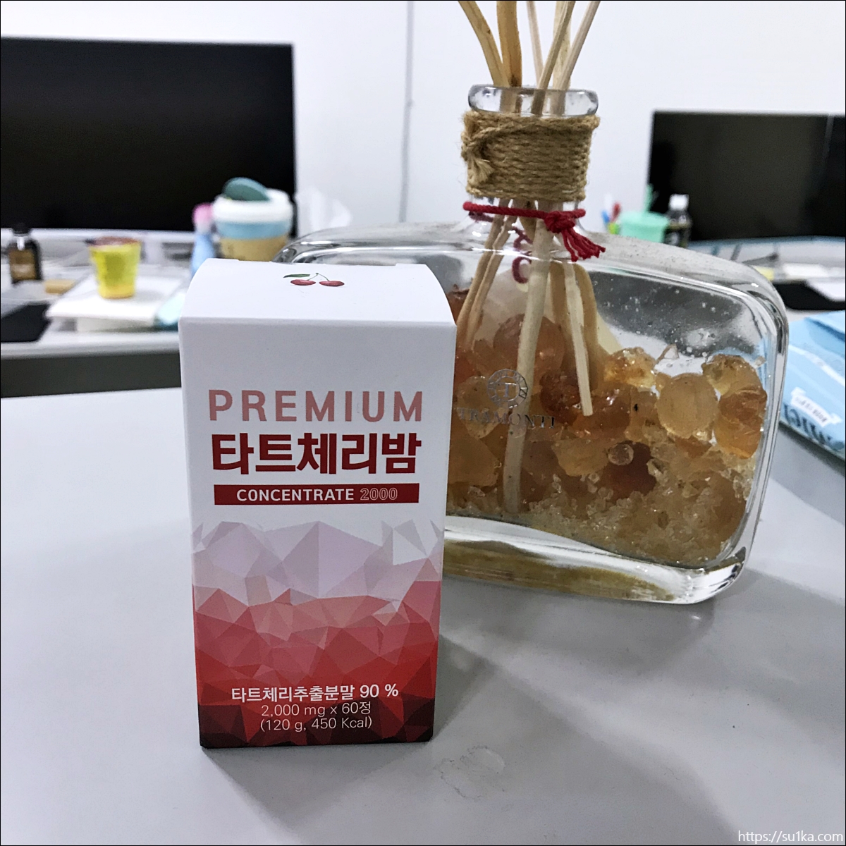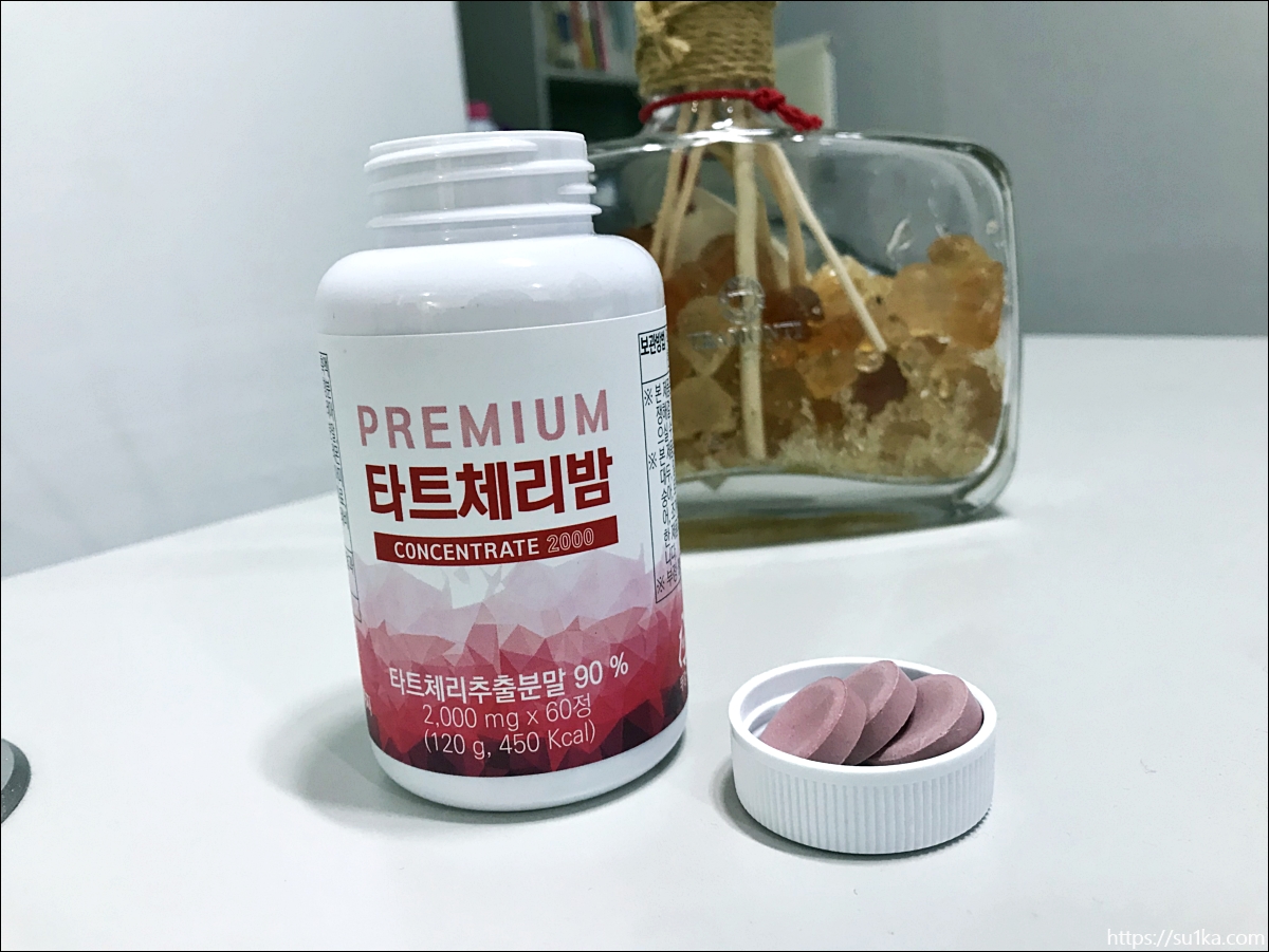 책상에 쉽게 놓고 먹을 수 있는 타트체리밤, 사실 분말도 좋긴 한데 타트체리 농축액을 이렇게 동그랗게 먹기좋게 만든게 저한테는 더 잘 맞는 것 같았습니다.