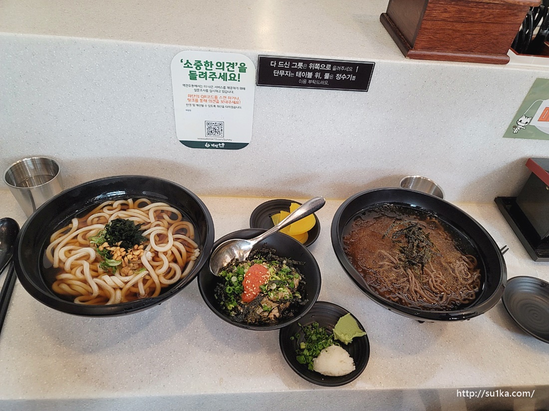 제가 좋아하는 우동과 모밀을 곱빼기로 시켰고 명란 미니덮밥을 시켜보았습니다.