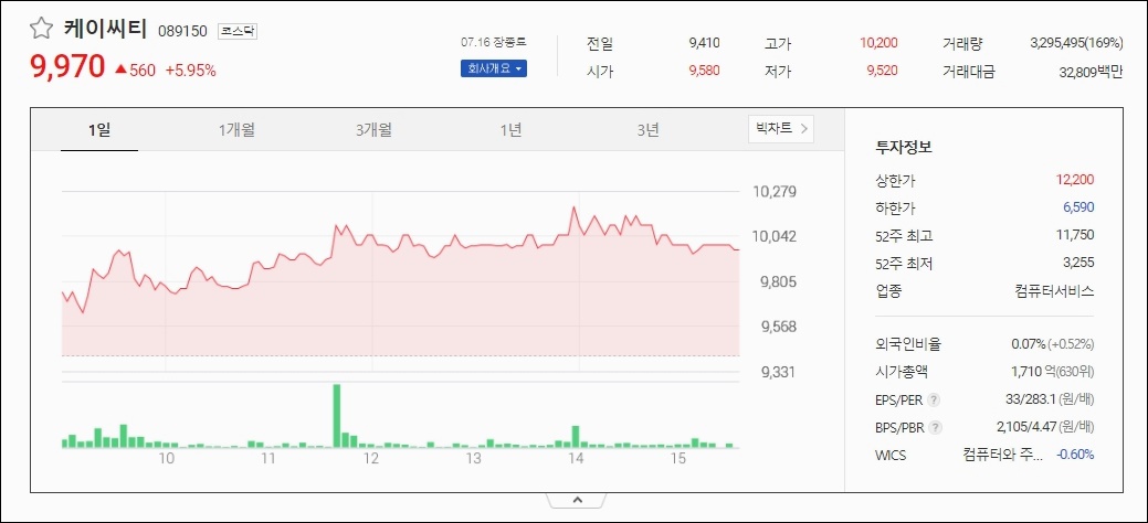 케이씨티 주가는 1주당 9,970원이며 7월 16일 장 종료 기준으로 +5.95% 상승하며 마감하였습니다.