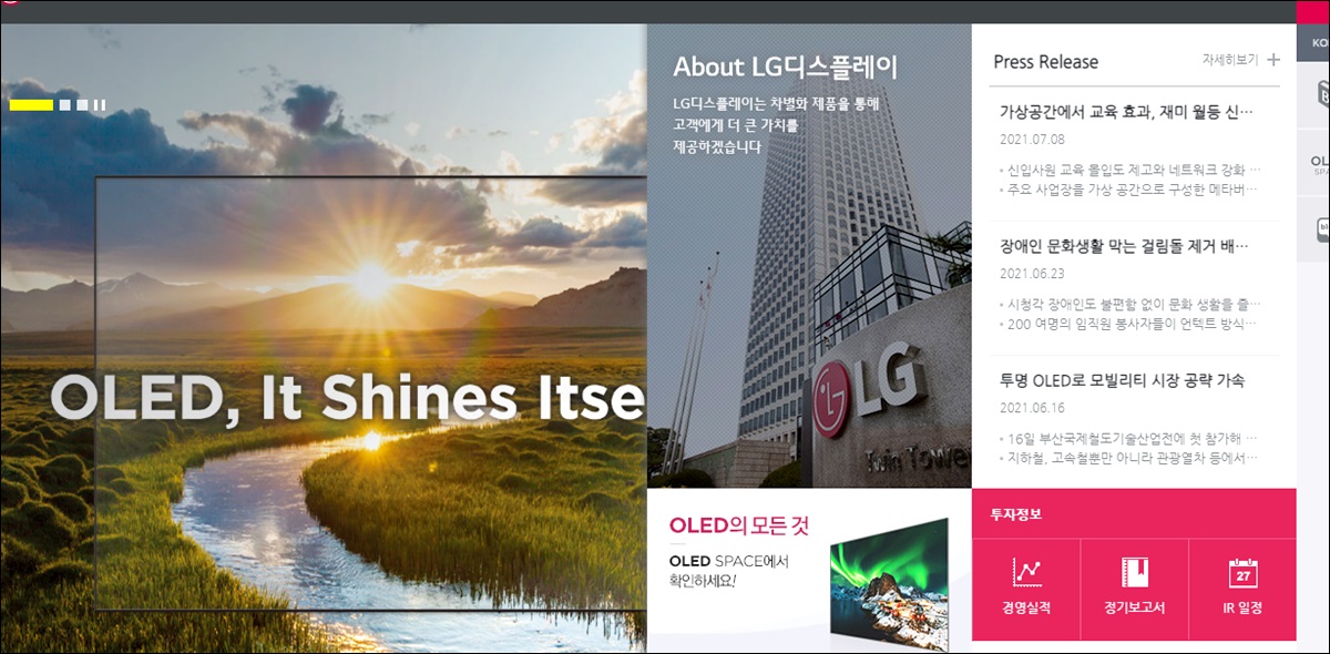 보도 자료에 의하면 LG디스플레이는 투명 OLED등으로 모빌리티 시장 공략까지 가속화 할 것이라고 밝히고 있는 것 같습니다. OLED 관련주로 알려진 만큼 관련 사업에 뚜렷한 정체성과 목표의식이 보이는 회사 메인페이지였습니다.