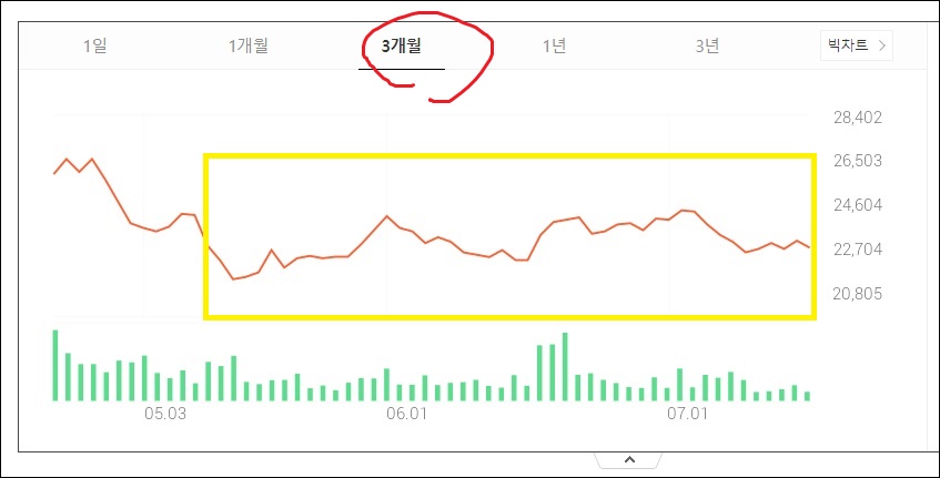 LG디스플레이 주가의 3개월 치 차트입니다. 5월 초 주가의 눈에 띄는 하락 이후 6월, 7월 동안은 2만 원대 언저리에서 주가의 박스권이 형성되었습니다.