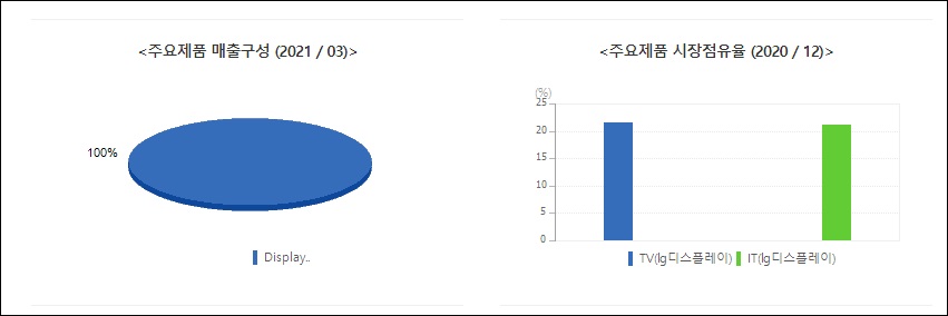LG디스플레이 매출 분석을 위한 매출구성과 주요 제품 시장점유율을 확인할 수 있습니다. 디스플레이 부분이 100%에 달하며 TV와 IT 디스플레이를 확인할 수 있습니다.