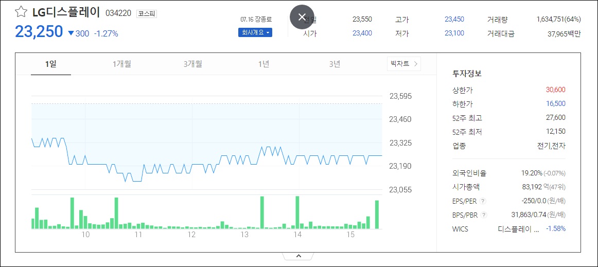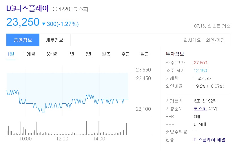 LG디스플레이는 1주당 가격이 2만 3천원 이상이 되는 주식이며, 시가총액은 8조 3,192억으로 시총 순위로는 코스피 47위라고 합니다.