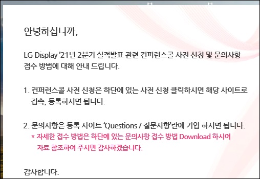또한 LG디스플레이 21년 2분기 실적발표 컨퍼러스콜 사전 신청에 관련한 링크는 LG디스플레이 홈페이지 메인화면에서 찾아볼 수 있습니다. 컨퍼런스콜을 사전 신청하실 분들은 참조해서 해당 사이트에 방문하셔서 등록을 하시면 될 것 같습니다.