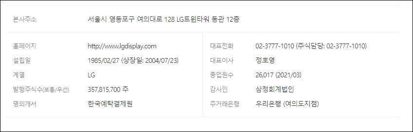LG디스플레이 본사는 서울시 영등포구 여의대로에 위치했다고 하며, 설립일은 1985년경입니다. LG디스플레이가 LG계열사라는 것쯤은 회사 이름에서부터 살펴볼 수 있는 사실이고요, 대표이사는 정호영 님입니다. 삼정회계법인에서 감사를 하고 있는 것으로 보입니다.