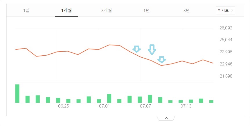 1개월 치 차트로 보면 LG디스플레이 주가에서 하락구간이 확인됩니다. 7월 초반에 한 번 눈에 띄는 하락이 보였습니다.
