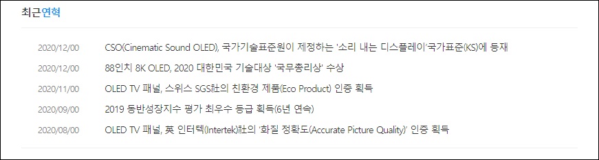 LG디스플레이는 CSO 라고 하는 Cinematic Sound OLED가 국가표준원이 제정하는 소리 내는 디스플레이 국가표준 KS에 등재됐다고 합니다. 또한 88인치 8K OLED와 OLED TV 패널 등에 관련한 소식을 알아볼 수 있었습니다. 국내뿐만 아니라 스위스 SG사의 친환경 제품 인증을 획득했다는 부분과 미국 인터텍의 화질 정확도 인증을 획득했다는 부분까지 확인하시면 좋을 것 같습니다.