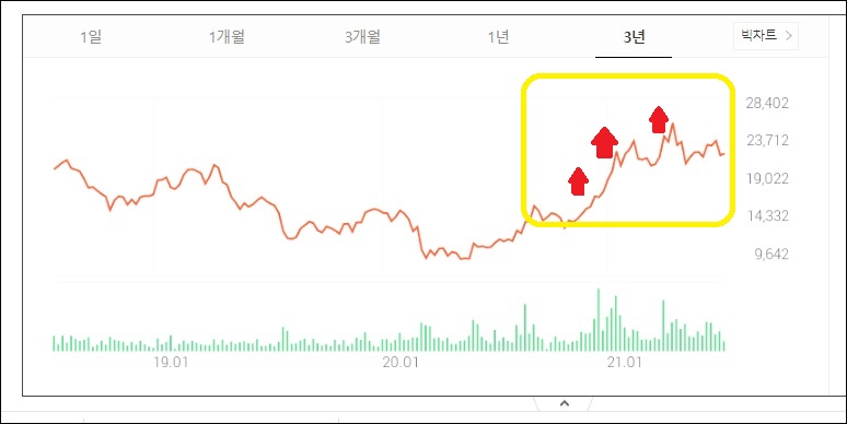 LG디스플레이 주가의 3년 치 흐름입니다. 2019년과 2020년 주가가 계속해서 하락하였지만 2021년 초반부터 급속도로 주가가 상승하여 만원 대를 깨고 2만 원 초~중반선까지 안착하였습니다. 앞으로 OLED 시장에서 선방을 한다면 주가에도 호재가 있을 것으로 예상이 됩니다.