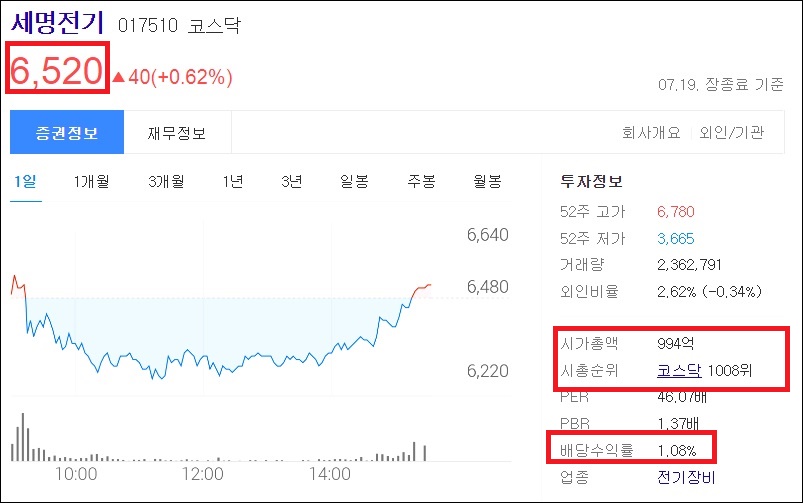 6천 원대의 지폐주이며, 시가 총액으로는 994억이고, 시총 순위로 코스닥 1008위에 달하는 기업입니다. 외인 비율은 2.62%이며 세명전기 배당금이 궁금하신 분들은 배당수익률 1.08%도 알아두시면 투자에 도움이 될 것 같습니다.
