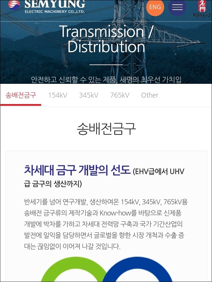 세명전기가 생산하는 송배전 금구류의 종류를 확인 가능하며, 차세대 전력망 구축과 동시에 국가 기간산업의 발전을 생각하는 기업이라고 합니다. 이뿐만 아니라 글로벌 시장 개척에 대한 언급이 있는 것으로 보아 시장은 국내뿐만 아니라 해외까지 염두에 두고 있으므로 세명전기 주가 전망을 예상하실 때에 관련 사업의 이러한 점까지 분석해 보시면 좋을 듯합니다.